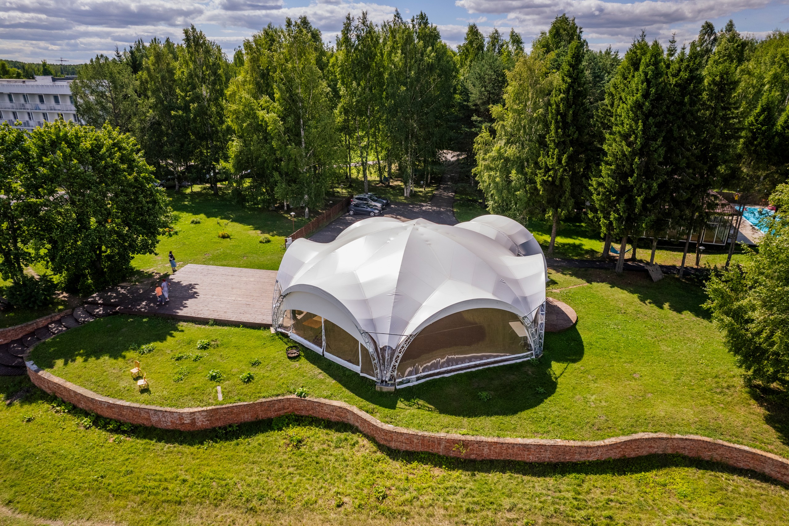 Белоснежный шатер стабилизировался в уединенной зеленой зоне с видом на Волгу.