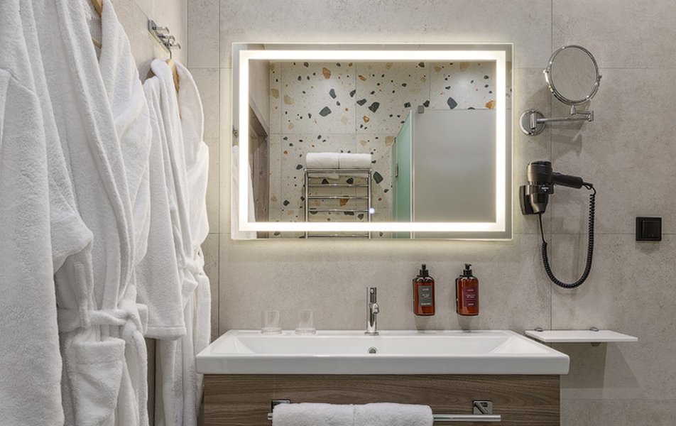 В номере: вешалка, зеркало, кресло, кровать двуспальная, прикроватные тумбочки, стол, тумба багажная, шкаф, мини-холодильник, сейф, телевизор ЖК, телефон, чайный набор посуды, электрочайник