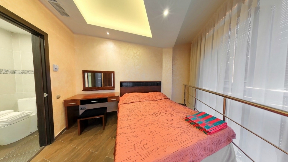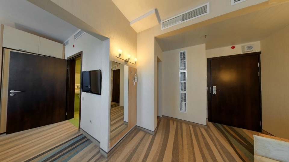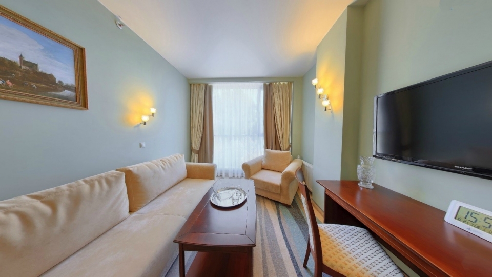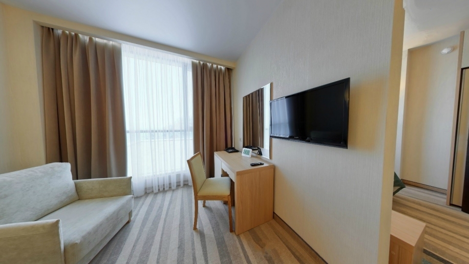 Оснащение номера: Двуспальная кровать, диван, обеденная группа, фен, тапочки, гладильный центр, телевизор, фригобар, шкаф для посуды, сервиз (6 персон), комплект столовых приборов (6 персон), сейф, wi-fi
