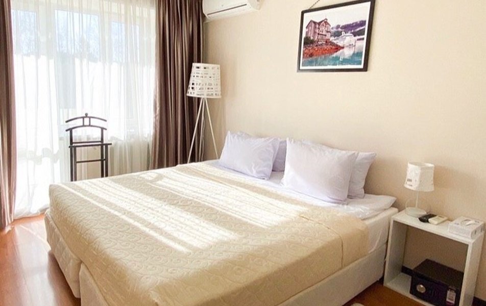 В номере: кухня, диван раскладной, кровать двуспальная, прикроватные тумбочки, стол, столик журнальный, стулья, шкаф, гладильная доска, кондиционер, микроволновая печь, набор посуды, плита электрическая, посудомоечная машина, телевизор, телефон, утюг, холодильник, электрочайник