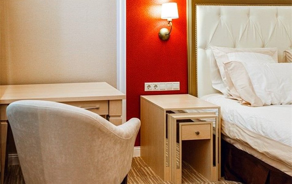 В номере: вешалка, зеркало, кровать двуспальная, прикроватные тумбочки, стол, стулья, шкаф, кондиционер, сейф, телевизор, телефон, холодильник