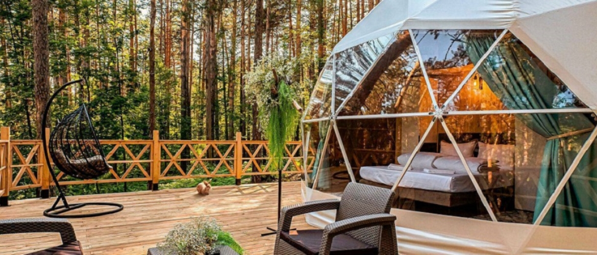 На территории площадью 50 га расположены комфортабельные дома со всеми удобствами: зеркальные дома, дизайнерские дома-сферы, полусферические дома с панорамным остеклением, большие двухэтажные шале, а также номера различной категории в отдельно стоящих корпусах.