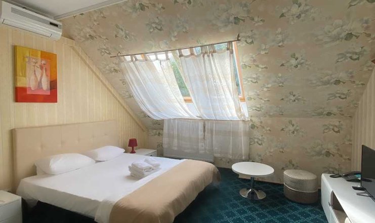 В номере: диван, зеркало, кровать двуспальная, прикроватные тумбочки, стол, стулья, кондиционер, мини-холодильник, сейф, телевизор ЖК, телефон