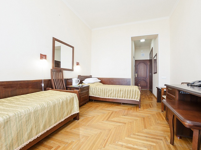 В номере: две односпальные кровати, тумба прикроватная, тумба TV, стенной шкаф для одежды, кресло мягкое, кондиционер, холодильник, телевизор, чайник электрический, телефон, набор посуды