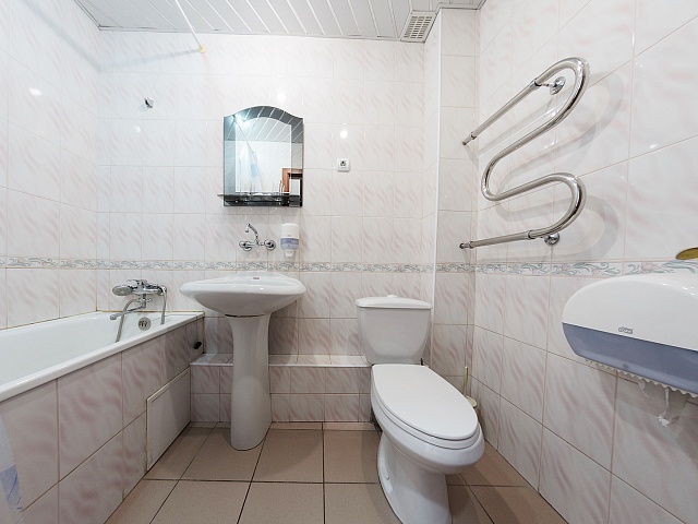 Санузел: раковина, унитаз, ванна или душевая кабина, фен