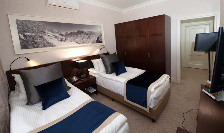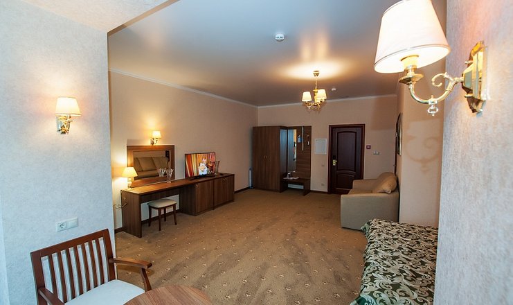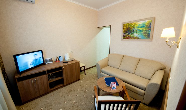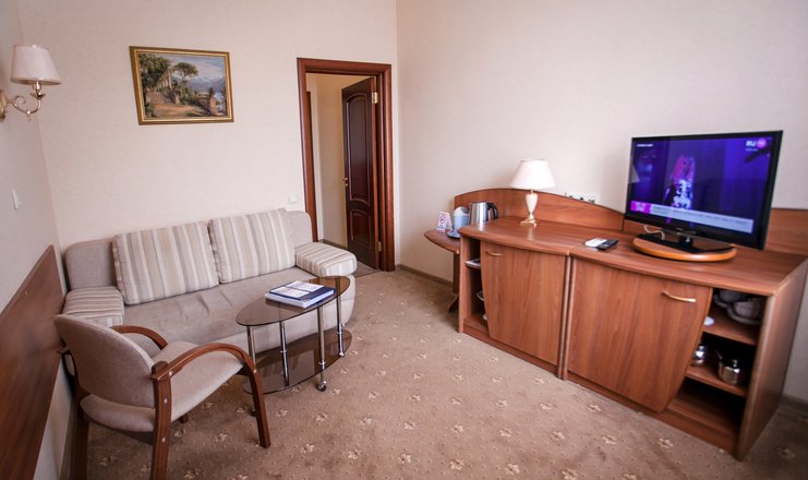 В номере: кровать двуспальная, стол, столик туалетный, стулья, тумба под телевизор, диван, гладильная доска, набор посуды, сейф, сплит-система, телевизор, утюг, холодильник, электрочайник
