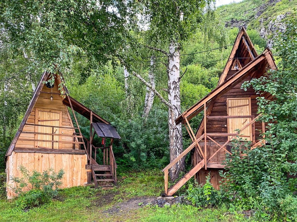 Комплекс занимает пространство с живописными речными и горными пейзажами. Гостям предлагаются различные варианты размещения: уютные деревянные домики из сосны и кедра, большие коттеджи с комфортными номерами или палатки на территории базы отдыха. В домиках предусмотрены индивидуальные или общие санузлы, а некоторые из них оснащены джакузи. Кроме того, в номерах и коттеджах есть электрочайники и холодильники.